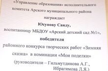 Воспитанница младшей группы Юсупова Саида стала победителем в районном конкурсе творческих работ "Зимняя сказка" в номинации "Мои поделки". Умничка! Желаем дальнейших успехов!