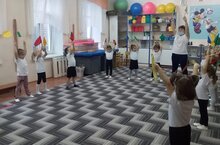 В ходе занятия дети младшей группы с удовольствием выполняли упражнения с разноцветными флажками совместно с инструктором по физкультуре. Выполнение упражнений с флажками повышает у детей интерес к занятиям, улучшает качество их выполнения, приучает владеть предметами, способствует формированию правильной осанки./Дәрес барышында кече төркем балалары физкультура инструкторы белән берлектә төрле төстәге флаглар белән күнегүләрне бик теләп башкардылар. Флаглар белән күнегүләр ясау балаларда дәресләр белән кызыксыну уята, аларны башкару сыйфатын яхшырта, әйберләргә ия булырга өйрәтә, дөрес позиция формалаштыруга ярдәм итә.