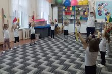 Сегодня в ходе занятия дети младшей группы с удовольствием выполняли упражнения с разноцветными флажками совместно с инструктором по физкультуре Низамиевой И.А. Выполнение упражнений с флажками повышает у детей интерес к занятиям, улучшает качество их выполнения, приучает владеть предметами, способствует формированию правильной осанки./Бүген кече төркем балалары физкультура инструкторы Низамиева И.А. белән берлектә төрле төстәге флаглар белән күнегүләр ясадылар.Флаглар белән күнегүләр ясау балаларда кызыксынуны арттыра, аларны башкару сыйфатын яхшырта, предметларга ия булырга өйрәтә, дөрес позиция формалаштыруга ярдәм итә.