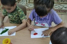 В средней группы - художественное творчество (рисование). Тема:"Любимый овощ". Цель: познакомить с названиями овощей местом их выращивания, учить описывать овощи, работать красками, развивать логическое мышление, закреплять умение чисто промывать кисть перед использованием краски другого цвета./Тема:"яраткан яшелчә". Максат:балаларны яшелчәләр белән таныштыру, аларның кайда, ничек үсүләре турында, ничек аларны танып белергә кирәклеген өйрәтү. Эш барышында ясалган яшелчәләрне дөрес итеп үз төсләренә буярга, куйган максатыбызга ирешеп, рәсем дәресендә кулланган җиһазларны тәртип белән җыештыру иде.