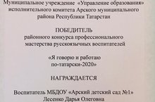 Поздравляем победителя районного конкурса профессионального мастерства русскоязычных воспитателей "Я говорю и работаю по-татарски-2020" Лесенко Дарью Олеговну! Желаем дальнейших успехов!