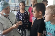 Пошли в её кабинет на экскурсию. Она показала детям медицинские инструменты: шпатель, фонедоскоп, ростомер,кушетку,градусник и т.д. Показала как ими пользоваться. Подготовительная группа узнала,что врач- уважаемый человек,который всегда придет на помощь и поможет. Ещё вспомнили и закрепили название врача для животных- ветеринар.
