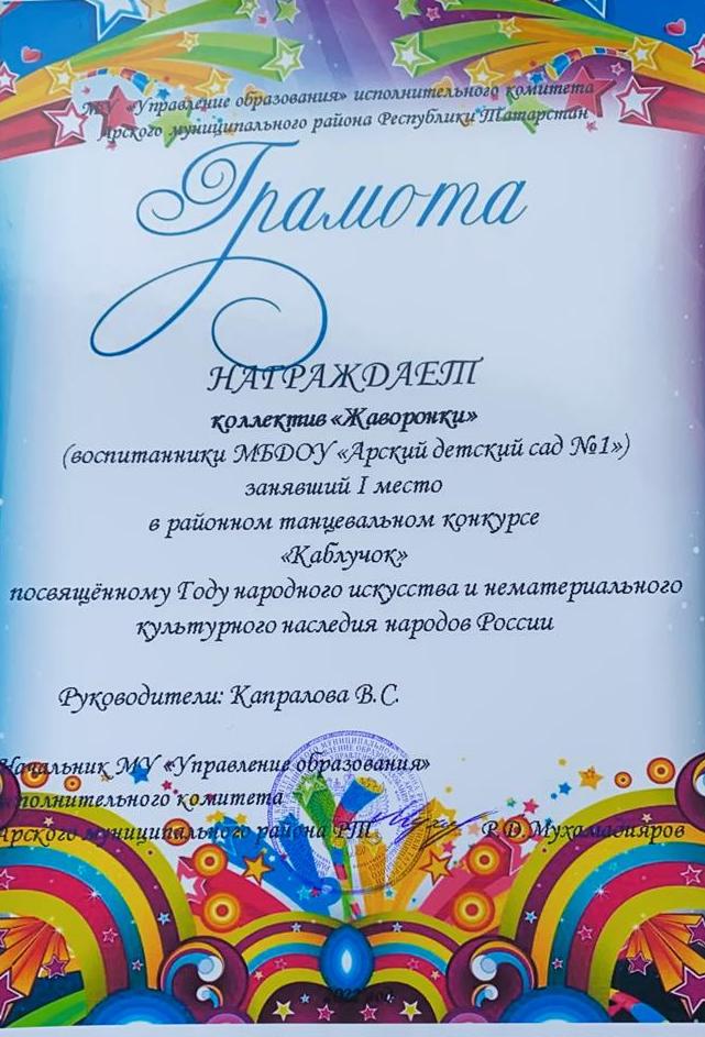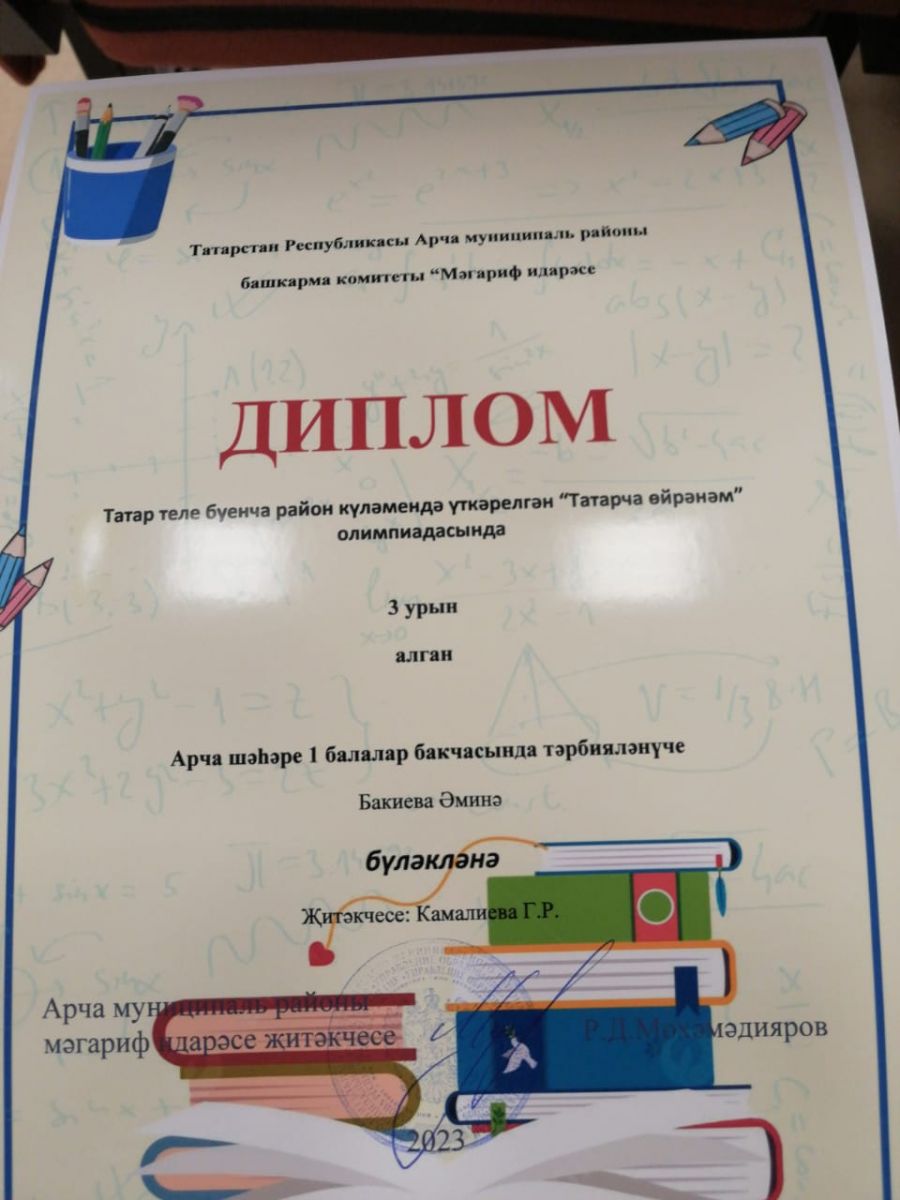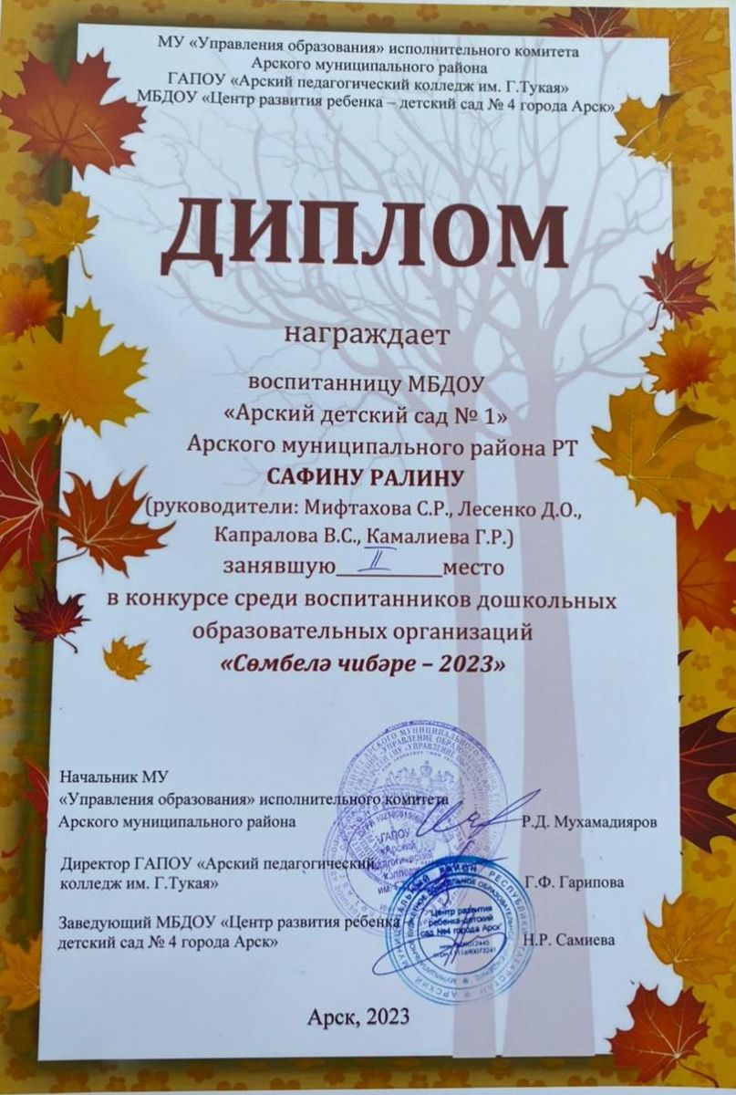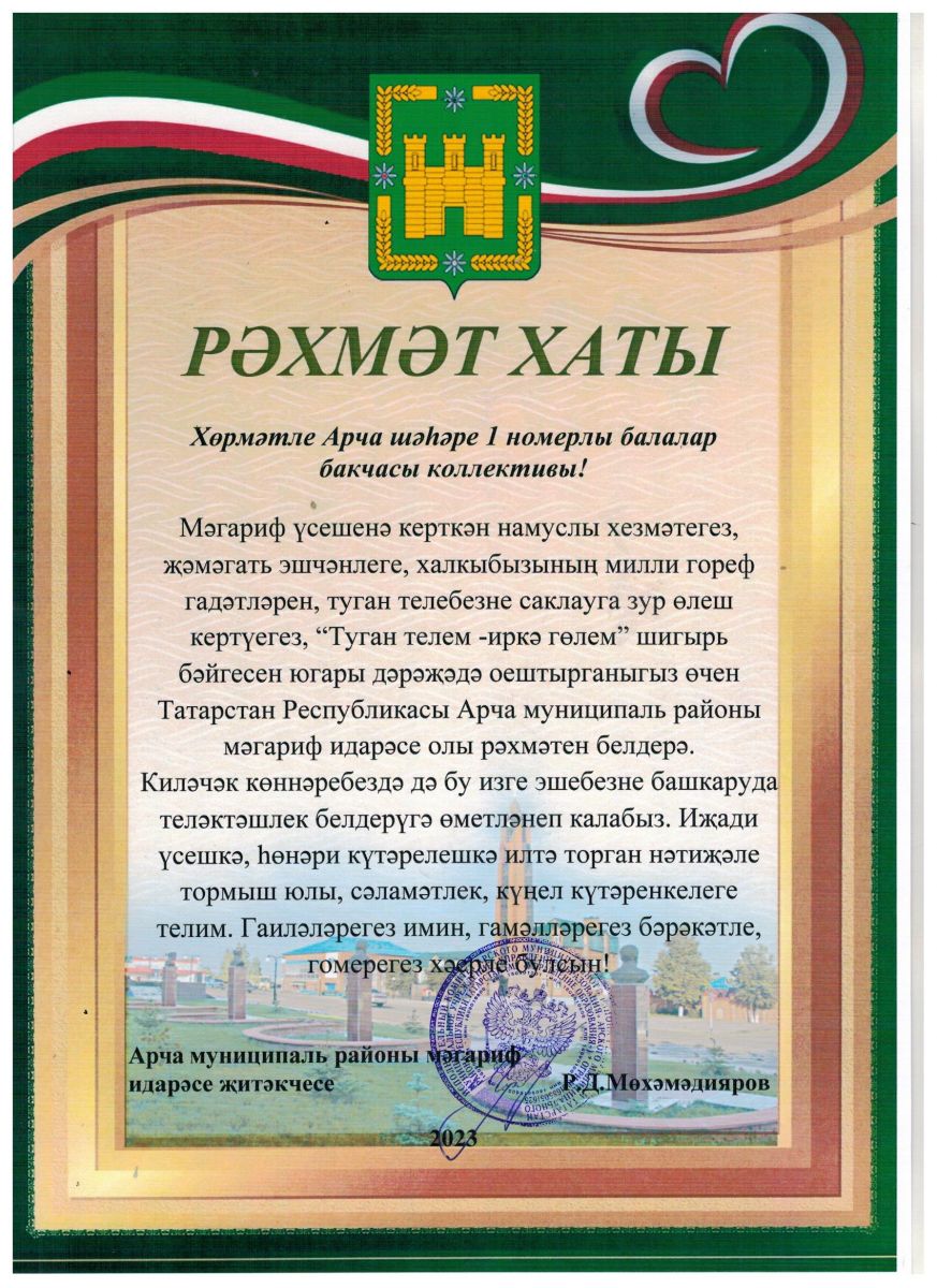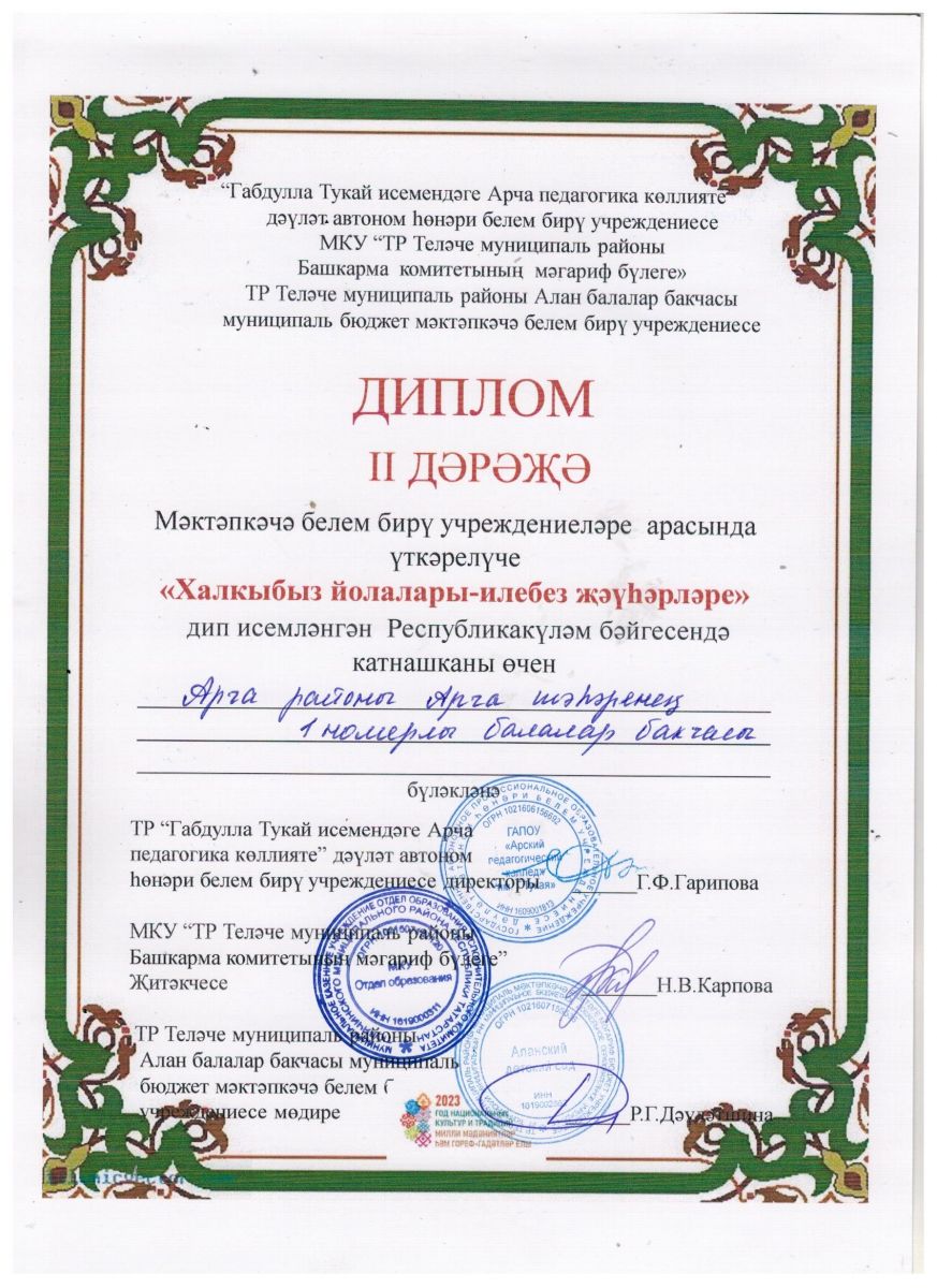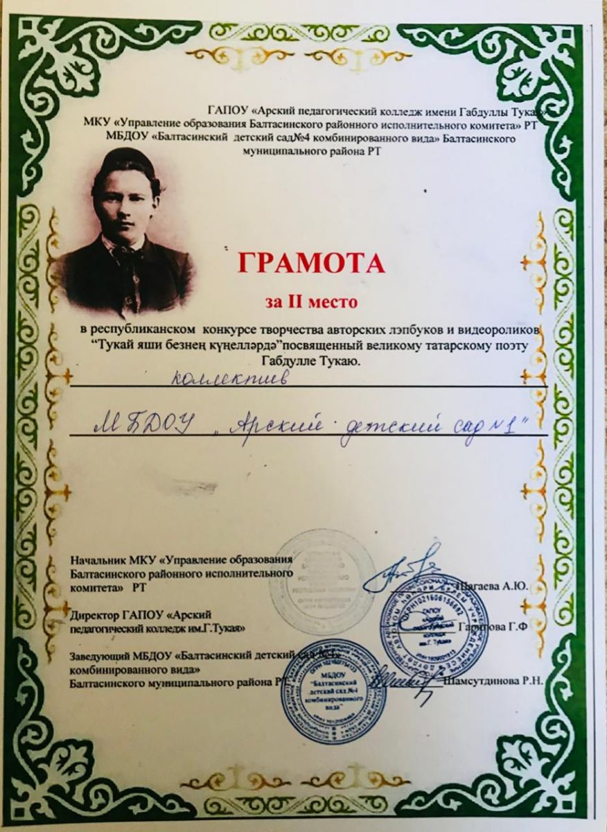 Конкурсы /Джалиловские чтения 2019 001.jpg /Кукла в национальном костюме, 2019 001.jpg Милли почмак,2019 001.jpg Мастер -класс ДОУ,2019 001.jpg,/Диплом 3 степени Зима 2019-2020 Снежные узоры 001.jpg, /диплом Зима 2019-2020 001.jpg,/ Диплом Новогодний калейдоскоп 2019-2020 001.jpg грамота за проведение регионального семинара 001 январь 2020.jpg Гран -при Гаилэ фестивале,2020.jpg, /Диплом за организацию районного шашечного турнира 001(2).jpg ДИПЛОМ 2 место по ПДД 001.jpg Диплом за 1 место по сдаче норм ГТО 001.jpg, Подарок для Елочки, 2019.png, Диплом Созвездие 2020 001.jpg, "Доутесса" Ахунова А.А., 2020.jpg, "Призвание" Габдульбарова А.Р.2020.jpg, "Школа будущего" Тухфатуллина Э.Р. 2020.jpg, Лучший цветочный костюм-2020.jpg, "Воспитатель года - 2020" Бахтиярова И.И.jpg, Тонкий лед Лесенко.jpeg, Благодарственное письмо Лесенко.jpeg, Благодарственное письмо МСЧ Лесенко.jpeg. Благодарственное письмо УГЗ Арского муниц_района Лесенко.jpeg. Джалиловские чтения Валиева Аделя, 2020.jpeg. Нэни Сомбля Нуретдинова Аделина, 2020.jpeg, "Школа будущего" Лесенко, 2020.jpeg, "Метод.разработки Бахтиярова И.И."pdf, "Дартс", 1 место Бакиева Э.И., 2020.jpg, "Буду бдительным на льду и на воде", Байрамов С., 2020.jpg, "Теннис" Ахунова А.А., 2020.jpg, Моя любимая мама, Хакимзянова И_,2020.jpg, Благодарность за лучший рисунок Шагеев Р,, 2020.jpg, Благодарность за лучший рисунок Сигагатуллин Р_, 2020.jpg, Благодарность за лучший рисунок Ахметханов, 2020(1).jpg, Благодарность за лучший рисунок Ахунов И_, 2020.jpg, Благодарность за лучший рисунок Ефимова, 2020.jpg, Благодарность за лучший рисунок Зарипов А_, 2020.jpg, Милли почмак 2020.jpg, Буду бдительным на льду Мингазова 2020.jpg, Сердце отдаю детям, Абдуллина Э_Х_, 2020.jpg, Сдай макулатуру - спасибо дерево, 2020.jpg, Инновационный матер класс, Габдульбарова А_Р, 2020.jpg, Советы педагогического мастерства, Сагитова Г_Ф_, 2020.jpg, Школа будущего, Сагитова Г_Ф_, 2020.jpg, Благодарственное Хисамутдинова Г_А_,2020.jpg, Грамота Хисамутдинова Г_А_2020.jpg, Голосок-2020, Нуретдинова Аделина.jpg, Шашки Ибрагимова Л_Я_2020.jpg, Новогоднее мероприятие 2020.jpeg, Экология - детский взгляд - Хусаинов И.jpg, Воспитатель года 2021 - Габдульбарова А.Р.jpg, Зимние фантазии Файзуллина Ясмина 2021.pdf, Татар сузе Абдуллина Зиля, 2021.jpg, Туган те Бакиевы.jpg, Арча йолдызлары 2021, Валиева А.jpeg, Грамота МУ, Бахтиярова И.И.2021.jpg, Герои А_Барто, Сафина З_2021.jpeg, Эти белэн бергэ, Миннебаевы, 2021.jpg, Лучший конспект Ахунова А_А,, 2021.jpeg, Ибрагимова Л_Я за участие в профсоюзной работе.jpeg, Татар кызчыгы 2021 Валиева А..jpg, Татар малае 2021 Багаутдинов И.jpg, Конкурс лэтбуков 2021.jpg, Конкурс лэтбуков "В мире животных" 2021.jpg, Евдокимов Р. Беби скиллс Арск.jpg, В созвездии А_С Пушкина и Г_Тукая, Файзрахманова К.jpg, Благодарность, Беби скилс Сагитова Г_Ф.jpg, Диплом 1 место Евдокимов Р, Беби скил.jpg, Легкая атлетика 2021, 3 место.jpg, Лучший скворечник 2021 Насыбуллин И.jpg, Ин милли тэрбияче 2021 Гильмутдинова А_А.jpg, Лучший скворечник-2021, Бариева А.jpg, Шигъриятнен якты йолдызы, Мустафин И_, 2021.jpg, Шигъриятнен якты йолдызы, Файзрахманова К_, 2021.jpg, Тукай в наших сердцах, Зарипова И, 2021.pdf, Тукай яши безнен кунелдэ, коллектив, 2021.jpeg, БДД, Ахунова А_А, 2021.jpg, Нэни Сомбелэ-2021 г. Котдусова Сафия.jpg, "Развивающая образовательная среда", Бахтиярова Илюса Ильсуровна(1).jpg, Джалильские чтения Нуретдинова А, 2021.jpg, Джалильские чтения 1 место, 2021.jpg, "ГИБДД конкурс сценариев" Мифтахова, Лесенко, 2021.jpg, ГИБДД конкурс сценариев Камалиева Г., 2021.jpg, Воспитатель года 2021 Лесенко.jpg, Ин яхшы мастер-класс Ахмадуллина 2021.jpg, Экологический сценарий, 2021.jpg, Джалиловские чтен