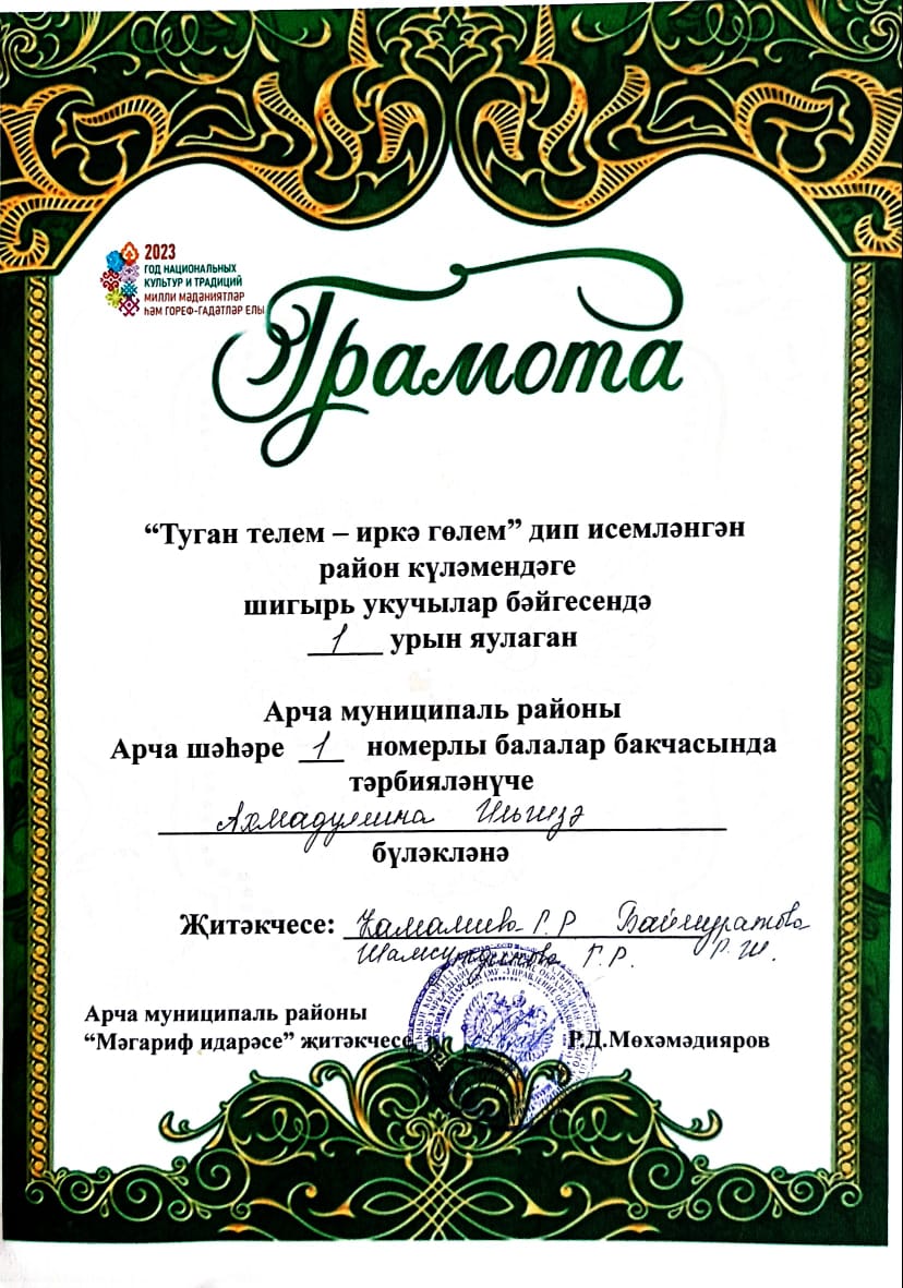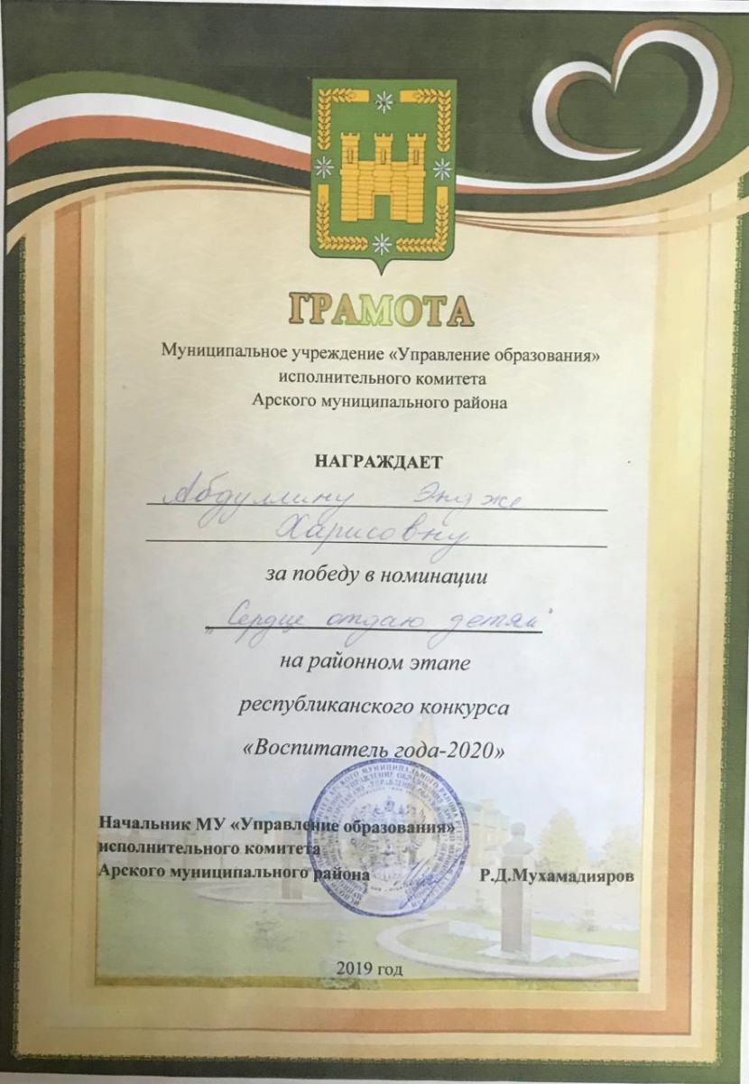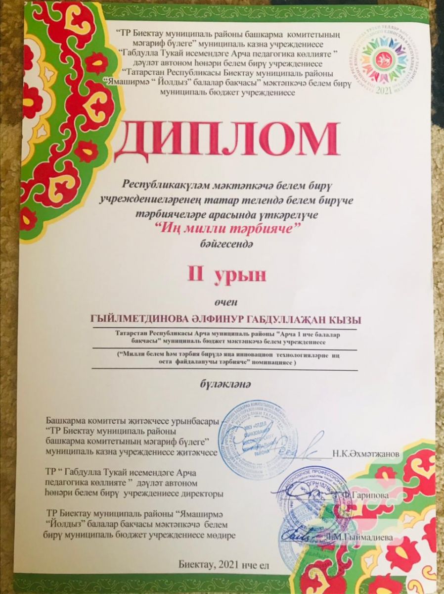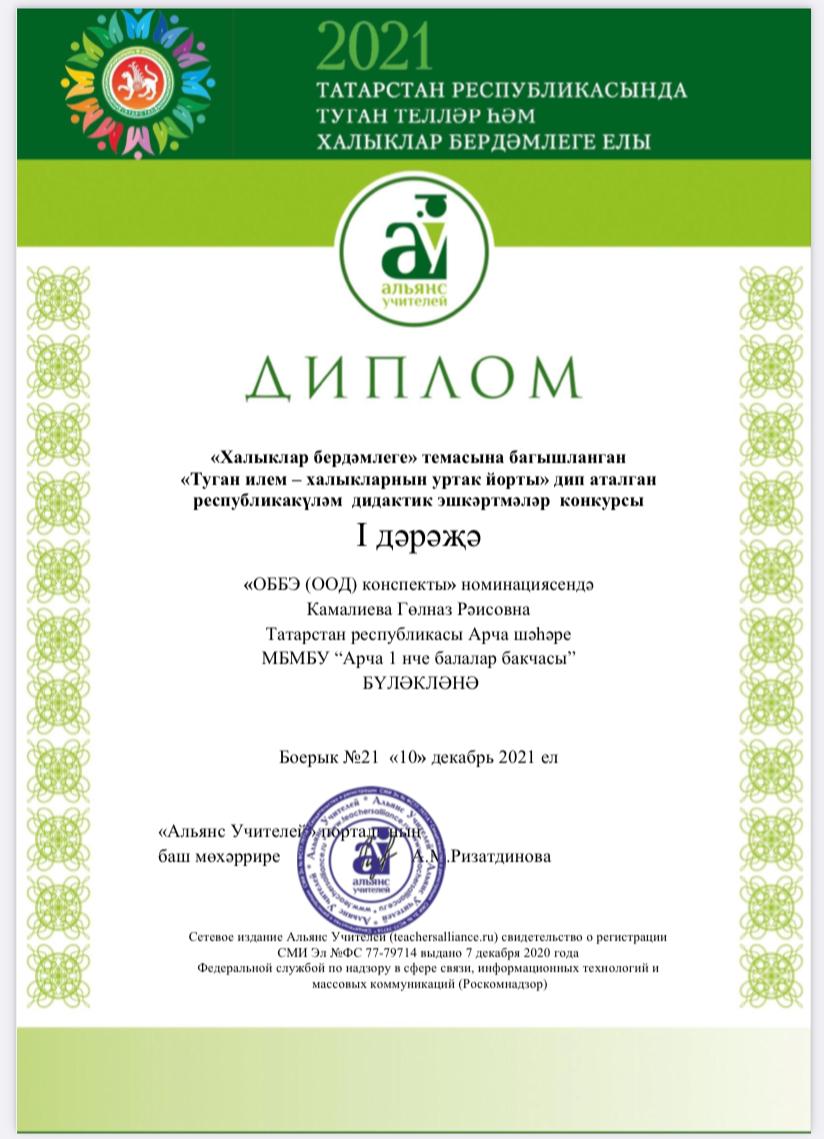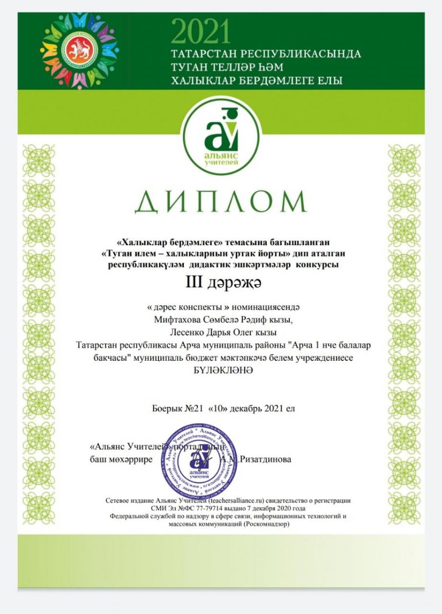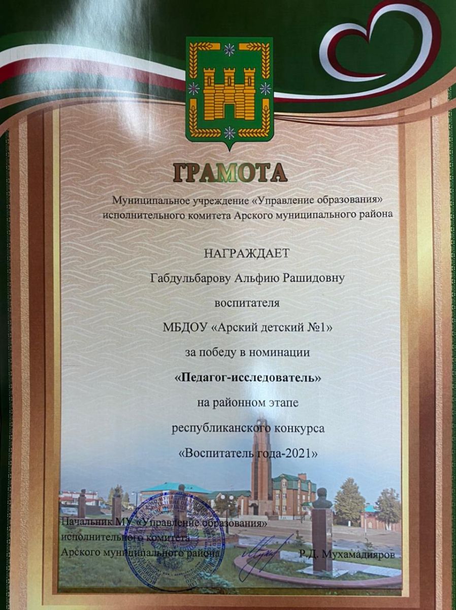 Конкурсы /Джалиловские чтения 2019 001.jpg /Кукла в национальном костюме, 2019 001.jpg Милли почмак,2019 001.jpg Мастер -класс ДОУ,2019 001.jpg,/Диплом 3 степени Зима 2019-2020 Снежные узоры 001.jpg, /диплом Зима 2019-2020 001.jpg,/ Диплом Новогодний калейдоскоп 2019-2020 001.jpg грамота за проведение регионального семинара 001 январь 2020.jpg Гран -при Гаилэ фестивале,2020.jpg, /Диплом за организацию районного шашечного турнира 001(2).jpg ДИПЛОМ 2 место по ПДД 001.jpg Диплом за 1 место по сдаче норм ГТО 001.jpg, Подарок для Елочки, 2019.png, Диплом Созвездие 2020 001.jpg, "Доутесса" Ахунова А.А., 2020.jpg, "Призвание" Габдульбарова А.Р.2020.jpg, "Школа будущего" Тухфатуллина Э.Р. 2020.jpg, Лучший цветочный костюм-2020.jpg, "Воспитатель года - 2020" Бахтиярова И.И.jpg, Тонкий лед Лесенко.jpeg, Благодарственное письмо Лесенко.jpeg, Благодарственное письмо МСЧ Лесенко.jpeg. Благодарственное письмо УГЗ Арского муниц_района Лесенко.jpeg. Джалиловские чтения Валиева Аделя, 2020.jpeg. Нэни Сомбля Нуретдинова Аделина, 2020.jpeg, "Школа будущего" Лесенко, 2020.jpeg, "Метод.разработки Бахтиярова И.И."pdf, "Дартс", 1 место Бакиева Э.И., 2020.jpg, "Буду бдительным на льду и на воде", Байрамов С., 2020.jpg, "Теннис" Ахунова А.А., 2020.jpg, Моя любимая мама, Хакимзянова И_,2020.jpg, Благодарность за лучший рисунок Шагеев Р,, 2020.jpg, Благодарность за лучший рисунок Сигагатуллин Р_, 2020.jpg, Благодарность за лучший рисунок Ахметханов, 2020(1).jpg, Благодарность за лучший рисунок Ахунов И_, 2020.jpg, Благодарность за лучший рисунок Ефимова, 2020.jpg, Благодарность за лучший рисунок Зарипов А_, 2020.jpg, Милли почмак 2020.jpg, Буду бдительным на льду Мингазова 2020.jpg, Сердце отдаю детям, Абдуллина Э_Х_, 2020.jpg, Сдай макулатуру - спасибо дерево, 2020.jpg, Инновационный матер класс, Габдульбарова А_Р, 2020.jpg, Советы педагогического мастерства, Сагитова Г_Ф_, 2020.jpg, Школа будущего, Сагитова Г_Ф_, 2020.jpg, Благодарственное Хисамутдинова Г_А_,2020.jpg, Грамота Хисамутдинова Г_А_2020.jpg, Голосок-2020, Нуретдинова Аделина.jpg, Шашки Ибрагимова Л_Я_2020.jpg, Новогоднее мероприятие 2020.jpeg, Экология - детский взгляд - Хусаинов И.jpg, Воспитатель года 2021 - Габдульбарова А.Р.jpg, Зимние фантазии Файзуллина Ясмина 2021.pdf, Татар сузе Абдуллина Зиля, 2021.jpg, Туган те Бакиевы.jpg, Арча йолдызлары 2021, Валиева А.jpeg, Грамота МУ, Бахтиярова И.И.2021.jpg, Герои А_Барто, Сафина З_2021.jpeg, Эти белэн бергэ, Миннебаевы, 2021.jpg, Лучший конспект Ахунова А_А,, 2021.jpeg, Ибрагимова Л_Я за участие в профсоюзной работе.jpeg, Татар кызчыгы 2021 Валиева А..jpg, Татар малае 2021 Багаутдинов И.jpg, Конкурс лэтбуков 2021.jpg, Конкурс лэтбуков "В мире животных" 2021.jpg, Евдокимов Р. Беби скиллс Арск.jpg, В созвездии А_С Пушкина и Г_Тукая, Файзрахманова К.jpg, Благодарность, Беби скилс Сагитова Г_Ф.jpg, Диплом 1 место Евдокимов Р, Беби скил.jpg, Легкая атлетика 2021, 3 место.jpg, Лучший скворечник 2021 Насыбуллин И.jpg, Ин милли тэрбияче 2021 Гильмутдинова А_А.jpg, Лучший скворечник-2021, Бариева А.jpg, Шигъриятнен якты йолдызы, Мустафин И_, 2021.jpg, Шигъриятнен якты йолдызы, Файзрахманова К_, 2021.jpg, Тукай в наших сердцах, Зарипова И, 2021.pdf, Тукай яши безнен кунелдэ, коллектив, 2021.jpeg, БДД, Ахунова А_А, 2021.jpg, Нэни Сомбелэ-2021 г. Котдусова Сафия.jpg, "Развивающая образовательная среда", Бахтиярова Илюса Ильсуровна(1).jpg, Джалильские чтения Нуретдинова А, 2021.jpg, Джалильские чтения 1 место, 2021.jpg, "ГИБДД конкурс сценариев" Мифтахова, Лесенко, 2021.jpg, ГИБДД конкурс сценариев Камалиева Г., 2021.jpg, Воспитатель года 2021 Лесенко.jpg, Ин яхшы мастер-класс Ахмадуллина 2021.jpg, Экологический сценарий, 2021.jpg, Джалиловские чтен