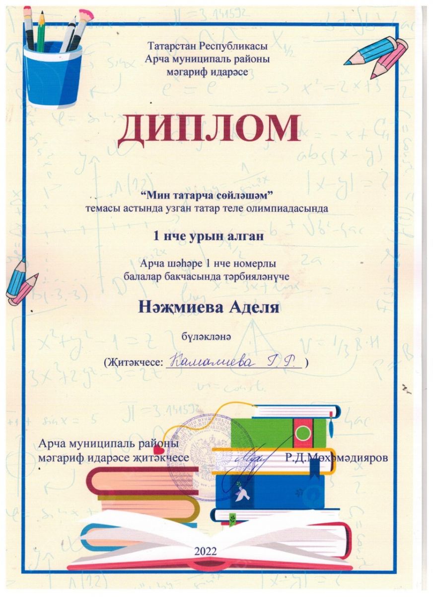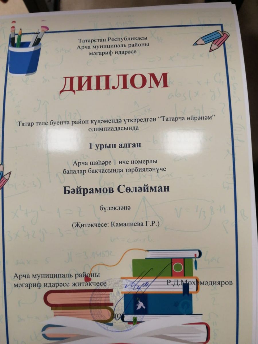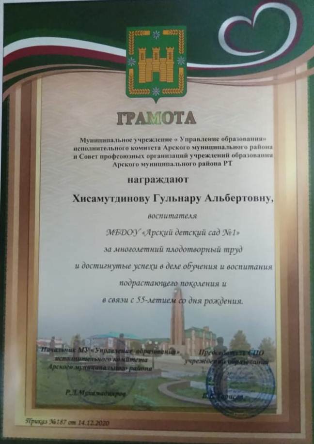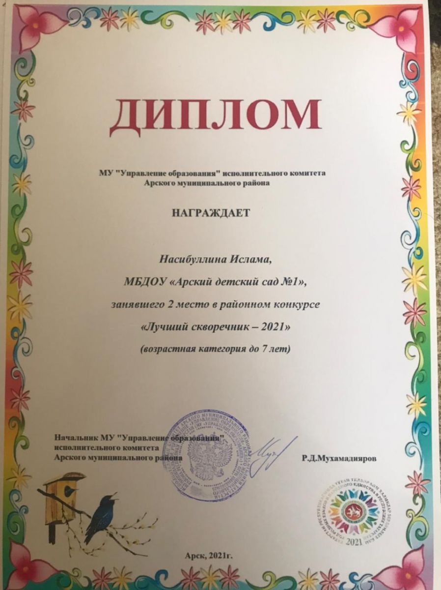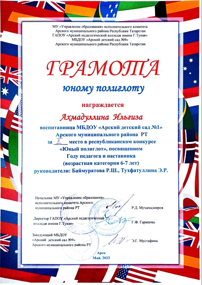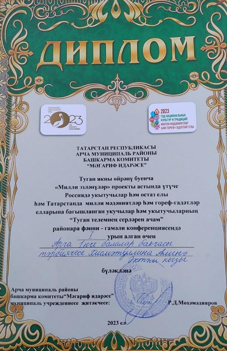 Конкурсы /Джалиловские чтения 2019 001.jpg /Кукла в национальном костюме, 2019 001.jpg Милли почмак,2019 001.jpg Мастер -класс ДОУ,2019 001.jpg,/Диплом 3 степени Зима 2019-2020 Снежные узоры 001.jpg, /диплом Зима 2019-2020 001.jpg,/ Диплом Новогодний калейдоскоп 2019-2020 001.jpg грамота за проведение регионального семинара 001 январь 2020.jpg Гран -при Гаилэ фестивале,2020.jpg, /Диплом за организацию районного шашечного турнира 001(2).jpg ДИПЛОМ 2 место по ПДД 001.jpg Диплом за 1 место по сдаче норм ГТО 001.jpg, Подарок для Елочки, 2019.png, Диплом Созвездие 2020 001.jpg, "Доутесса" Ахунова А.А., 2020.jpg, "Призвание" Габдульбарова А.Р.2020.jpg, "Школа будущего" Тухфатуллина Э.Р. 2020.jpg, Лучший цветочный костюм-2020.jpg, "Воспитатель года - 2020" Бахтиярова И.И.jpg, Тонкий лед Лесенко.jpeg, Благодарственное письмо Лесенко.jpeg, Благодарственное письмо МСЧ Лесенко.jpeg. Благодарственное письмо УГЗ Арского муниц_района Лесенко.jpeg. Джалиловские чтения Валиева Аделя, 2020.jpeg. Нэни Сомбля Нуретдинова Аделина, 2020.jpeg, "Школа будущего" Лесенко, 2020.jpeg, "Метод.разработки Бахтиярова И.И."pdf, "Дартс", 1 место Бакиева Э.И., 2020.jpg, "Буду бдительным на льду и на воде", Байрамов С., 2020.jpg, "Теннис" Ахунова А.А., 2020.jpg, Моя любимая мама, Хакимзянова И_,2020.jpg, Благодарность за лучший рисунок Шагеев Р,, 2020.jpg, Благодарность за лучший рисунок Сигагатуллин Р_, 2020.jpg, Благодарность за лучший рисунок Ахметханов, 2020(1).jpg, Благодарность за лучший рисунок Ахунов И_, 2020.jpg, Благодарность за лучший рисунок Ефимова, 2020.jpg, Благодарность за лучший рисунок Зарипов А_, 2020.jpg, Милли почмак 2020.jpg, Буду бдительным на льду Мингазова 2020.jpg, Сердце отдаю детям, Абдуллина Э_Х_, 2020.jpg, Сдай макулатуру - спасибо дерево, 2020.jpg, Инновационный матер класс, Габдульбарова А_Р, 2020.jpg, Советы педагогического мастерства, Сагитова Г_Ф_, 2020.jpg, Школа будущего, Сагитова Г_Ф_, 2020.jpg, Благодарственное Хисамутдинова Г_А_,2020.jpg, Грамота Хисамутдинова Г_А_2020.jpg, Голосок-2020, Нуретдинова Аделина.jpg, Шашки Ибрагимова Л_Я_2020.jpg, Новогоднее мероприятие 2020.jpeg, Экология - детский взгляд - Хусаинов И.jpg, Воспитатель года 2021 - Габдульбарова А.Р.jpg, Зимние фантазии Файзуллина Ясмина 2021.pdf, Татар сузе Абдуллина Зиля, 2021.jpg, Туган те Бакиевы.jpg, Арча йолдызлары 2021, Валиева А.jpeg, Грамота МУ, Бахтиярова И.И.2021.jpg, Герои А_Барто, Сафина З_2021.jpeg, Эти белэн бергэ, Миннебаевы, 2021.jpg, Лучший конспект Ахунова А_А,, 2021.jpeg, Ибрагимова Л_Я за участие в профсоюзной работе.jpeg, Татар кызчыгы 2021 Валиева А..jpg, Татар малае 2021 Багаутдинов И.jpg, Конкурс лэтбуков 2021.jpg, Конкурс лэтбуков "В мире животных" 2021.jpg, Евдокимов Р. Беби скиллс Арск.jpg, В созвездии А_С Пушкина и Г_Тукая, Файзрахманова К.jpg, Благодарность, Беби скилс Сагитова Г_Ф.jpg, Диплом 1 место Евдокимов Р, Беби скил.jpg, Легкая атлетика 2021, 3 место.jpg, Лучший скворечник 2021 Насыбуллин И.jpg, Ин милли тэрбияче 2021 Гильмутдинова А_А.jpg, Лучший скворечник-2021, Бариева А.jpg, Шигъриятнен якты йолдызы, Мустафин И_, 2021.jpg, Шигъриятнен якты йолдызы, Файзрахманова К_, 2021.jpg, Тукай в наших сердцах, Зарипова И, 2021.pdf, Тукай яши безнен кунелдэ, коллектив, 2021.jpeg, БДД, Ахунова А_А, 2021.jpg, Нэни Сомбелэ-2021 г. Котдусова Сафия.jpg, "Развивающая образовательная среда", Бахтиярова Илюса Ильсуровна(1).jpg, Джалильские чтения Нуретдинова А, 2021.jpg, Джалильские чтения 1 место, 2021.jpg, "ГИБДД конкурс сценариев" Мифтахова, Лесенко, 2021.jpg, ГИБДД конкурс сценариев Камалиева Г., 2021.jpg, Воспитатель года 2021 Лесенко.jpg, Ин яхшы мастер-класс Ахмадуллина 2021.jpg, Экологический сценарий, 2021.jpg, Джалиловские чтен