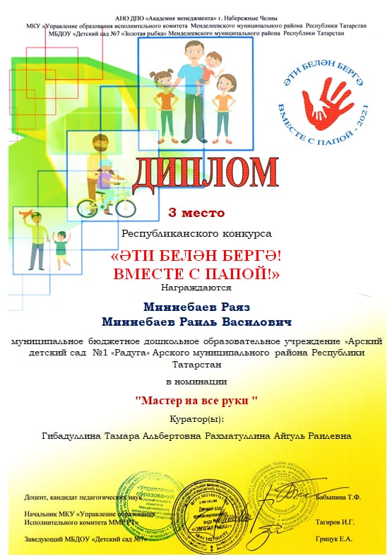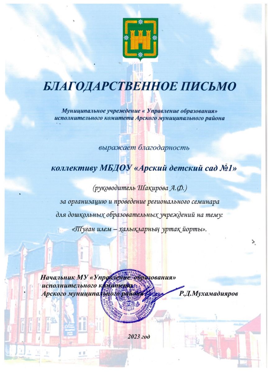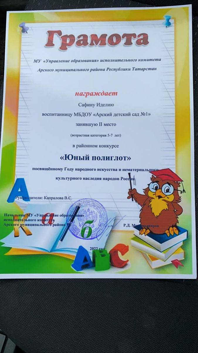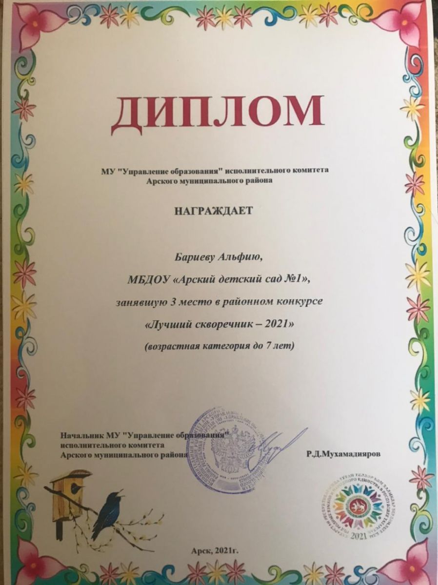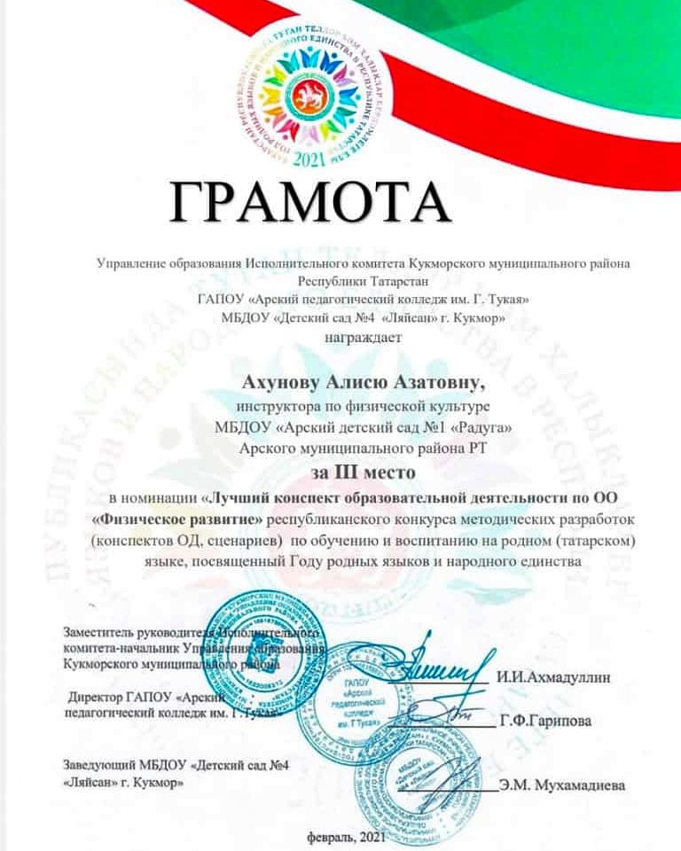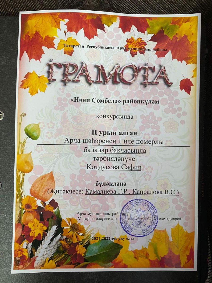 Конкурсы /Джалиловские чтения 2019 001.jpg /Кукла в национальном костюме, 2019 001.jpg Милли почмак,2019 001.jpg Мастер -класс ДОУ,2019 001.jpg,/Диплом 3 степени Зима 2019-2020 Снежные узоры 001.jpg, /диплом Зима 2019-2020 001.jpg,/ Диплом Новогодний калейдоскоп 2019-2020 001.jpg грамота за проведение регионального семинара 001 январь 2020.jpg Гран -при Гаилэ фестивале,2020.jpg, /Диплом за организацию районного шашечного турнира 001(2).jpg ДИПЛОМ 2 место по ПДД 001.jpg Диплом за 1 место по сдаче норм ГТО 001.jpg, Подарок для Елочки, 2019.png, Диплом Созвездие 2020 001.jpg, "Доутесса" Ахунова А.А., 2020.jpg, "Призвание" Габдульбарова А.Р.2020.jpg, "Школа будущего" Тухфатуллина Э.Р. 2020.jpg, Лучший цветочный костюм-2020.jpg, "Воспитатель года - 2020" Бахтиярова И.И.jpg, Тонкий лед Лесенко.jpeg, Благодарственное письмо Лесенко.jpeg, Благодарственное письмо МСЧ Лесенко.jpeg. Благодарственное письмо УГЗ Арского муниц_района Лесенко.jpeg. Джалиловские чтения Валиева Аделя, 2020.jpeg. Нэни Сомбля Нуретдинова Аделина, 2020.jpeg, "Школа будущего" Лесенко, 2020.jpeg, "Метод.разработки Бахтиярова И.И."pdf, "Дартс", 1 место Бакиева Э.И., 2020.jpg, "Буду бдительным на льду и на воде", Байрамов С., 2020.jpg, "Теннис" Ахунова А.А., 2020.jpg, Моя любимая мама, Хакимзянова И_,2020.jpg, Благодарность за лучший рисунок Шагеев Р,, 2020.jpg, Благодарность за лучший рисунок Сигагатуллин Р_, 2020.jpg, Благодарность за лучший рисунок Ахметханов, 2020(1).jpg, Благодарность за лучший рисунок Ахунов И_, 2020.jpg, Благодарность за лучший рисунок Ефимова, 2020.jpg, Благодарность за лучший рисунок Зарипов А_, 2020.jpg, Милли почмак 2020.jpg, Буду бдительным на льду Мингазова 2020.jpg, Сердце отдаю детям, Абдуллина Э_Х_, 2020.jpg, Сдай макулатуру - спасибо дерево, 2020.jpg, Инновационный матер класс, Габдульбарова А_Р, 2020.jpg, Советы педагогического мастерства, Сагитова Г_Ф_, 2020.jpg, Школа будущего, Сагитова Г_Ф_, 2020.jpg, Благодарственное Хисамутдинова Г_А_,2020.jpg, Грамота Хисамутдинова Г_А_2020.jpg, Голосок-2020, Нуретдинова Аделина.jpg, Шашки Ибрагимова Л_Я_2020.jpg, Новогоднее мероприятие 2020.jpeg, Экология - детский взгляд - Хусаинов И.jpg, Воспитатель года 2021 - Габдульбарова А.Р.jpg, Зимние фантазии Файзуллина Ясмина 2021.pdf, Татар сузе Абдуллина Зиля, 2021.jpg, Туган те Бакиевы.jpg, Арча йолдызлары 2021, Валиева А.jpeg, Грамота МУ, Бахтиярова И.И.2021.jpg, Герои А_Барто, Сафина З_2021.jpeg, Эти белэн бергэ, Миннебаевы, 2021.jpg, Лучший конспект Ахунова А_А,, 2021.jpeg, Ибрагимова Л_Я за участие в профсоюзной работе.jpeg, Татар кызчыгы 2021 Валиева А..jpg, Татар малае 2021 Багаутдинов И.jpg, Конкурс лэтбуков 2021.jpg, Конкурс лэтбуков "В мире животных" 2021.jpg, Евдокимов Р. Беби скиллс Арск.jpg, В созвездии А_С Пушкина и Г_Тукая, Файзрахманова К.jpg, Благодарность, Беби скилс Сагитова Г_Ф.jpg, Диплом 1 место Евдокимов Р, Беби скил.jpg, Легкая атлетика 2021, 3 место.jpg, Лучший скворечник 2021 Насыбуллин И.jpg, Ин милли тэрбияче 2021 Гильмутдинова А_А.jpg, Лучший скворечник-2021, Бариева А.jpg, Шигъриятнен якты йолдызы, Мустафин И_, 2021.jpg, Шигъриятнен якты йолдызы, Файзрахманова К_, 2021.jpg, Тукай в наших сердцах, Зарипова И, 2021.pdf, Тукай яши безнен кунелдэ, коллектив, 2021.jpeg, БДД, Ахунова А_А, 2021.jpg, Нэни Сомбелэ-2021 г. Котдусова Сафия.jpg, "Развивающая образовательная среда", Бахтиярова Илюса Ильсуровна(1).jpg, Джалильские чтения Нуретдинова А, 2021.jpg, Джалильские чтения 1 место, 2021.jpg, "ГИБДД конкурс сценариев" Мифтахова, Лесенко, 2021.jpg, ГИБДД конкурс сценариев Камалиева Г., 2021.jpg, Воспитатель года 2021 Лесенко.jpg, Ин яхшы мастер-класс Ахмадуллина 2021.jpg, Экологический сценарий, 2021.jpg, Джалиловские чтен