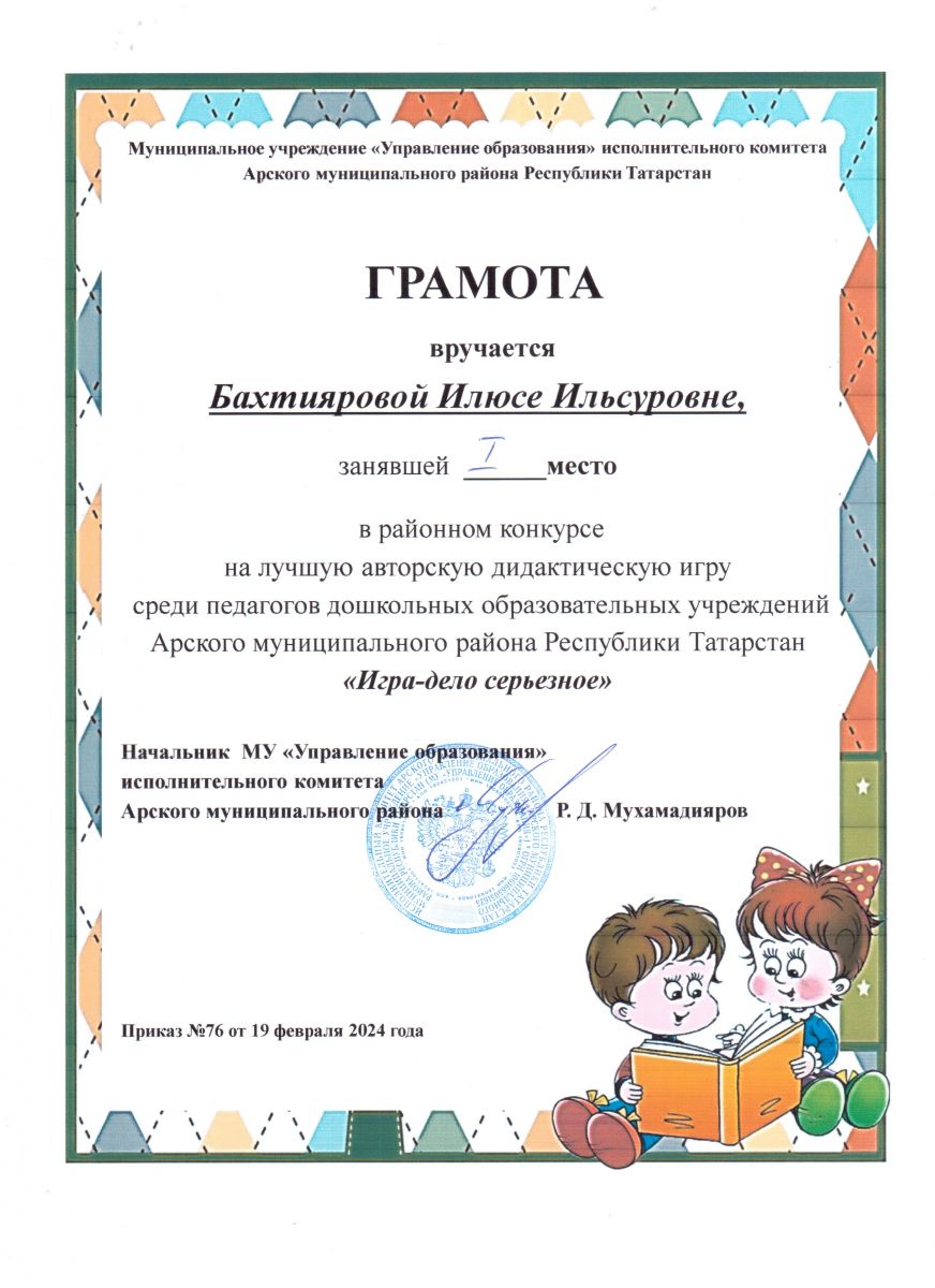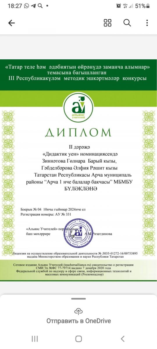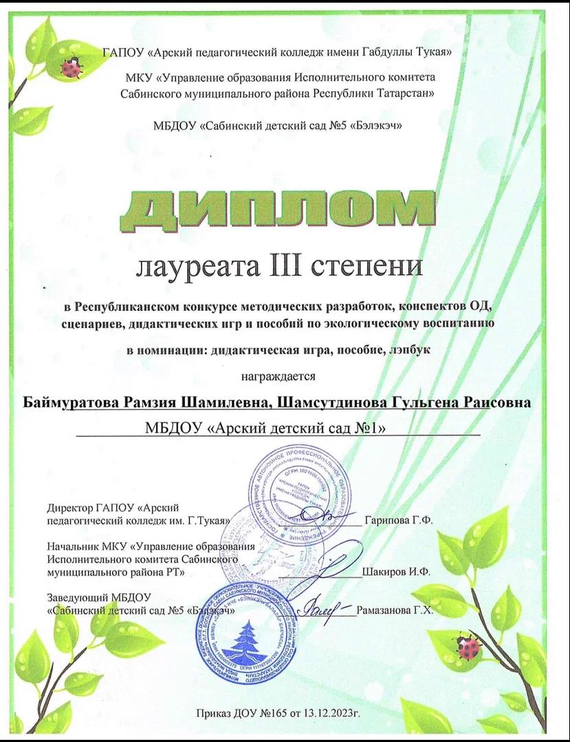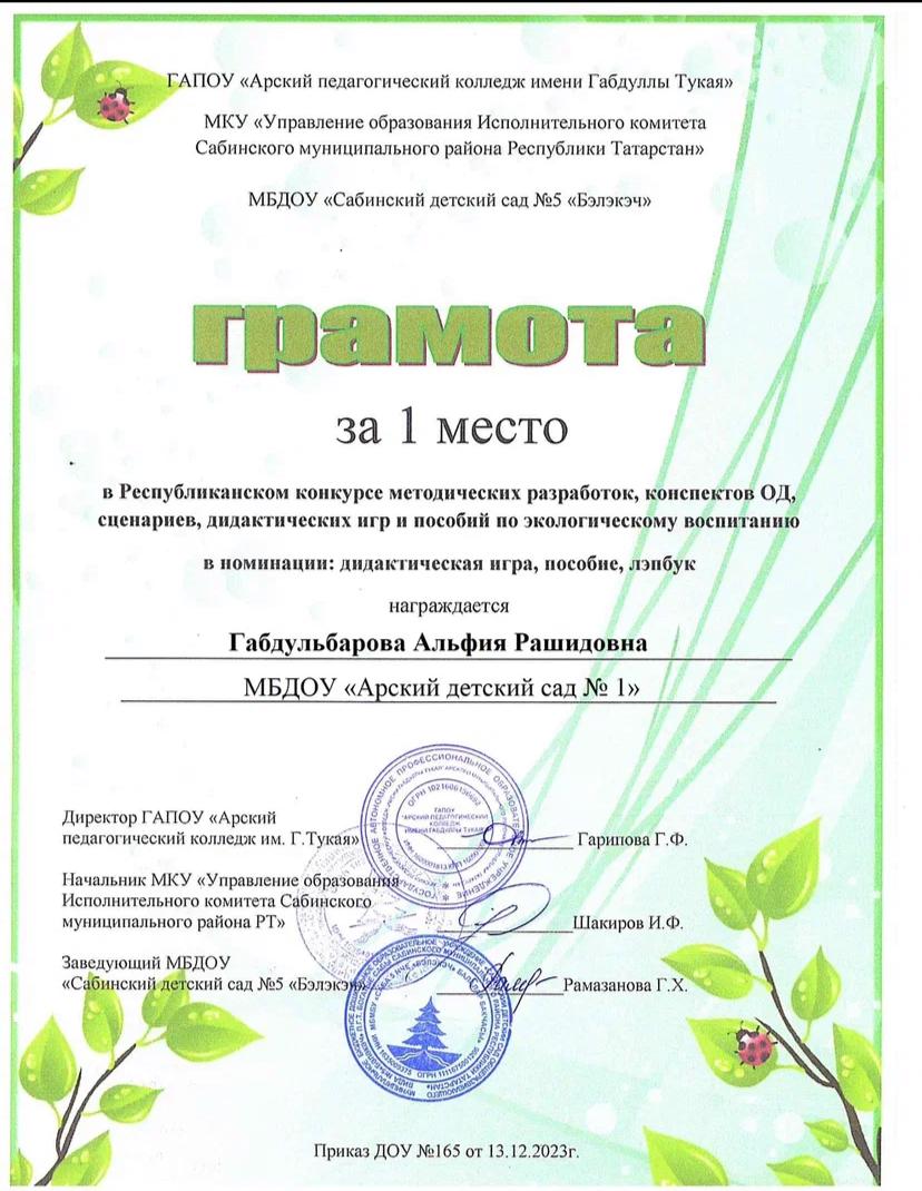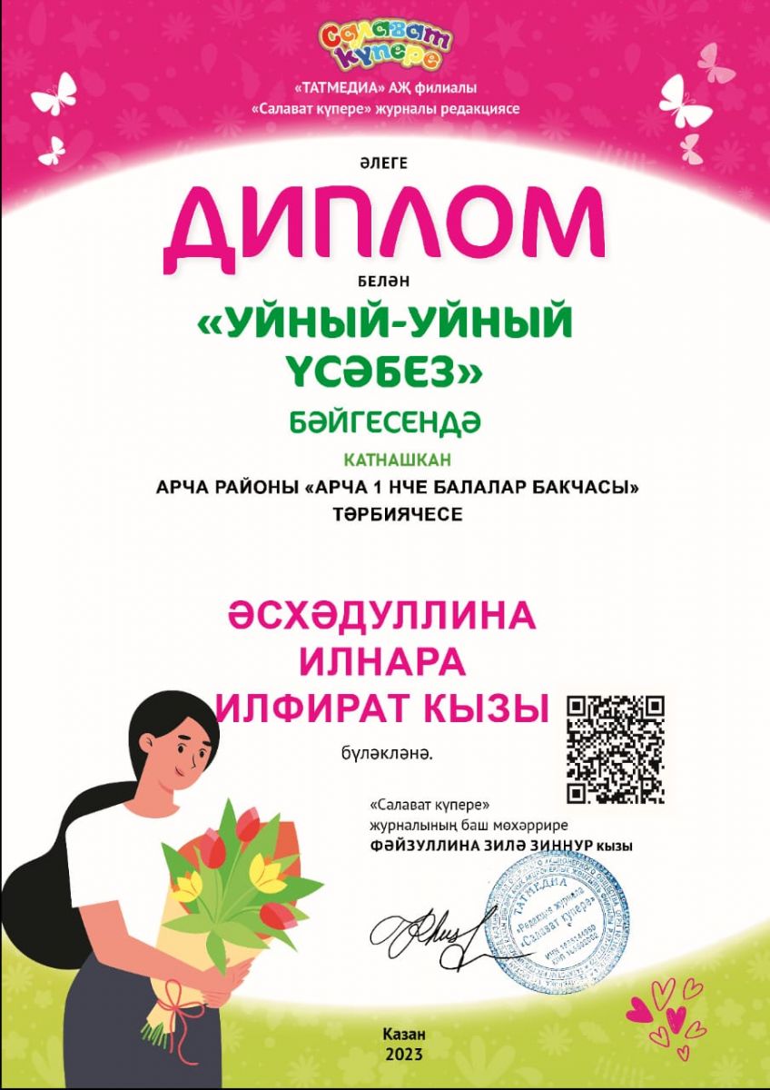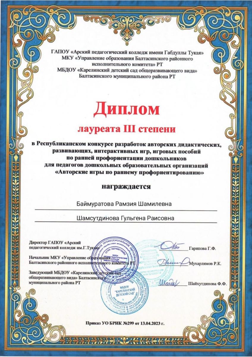 2023-2024 у.г. Дидактическая игра Зиннатова, Габдульбарова.jpg, Лэпбук Камалиева, Хакимова.jpg, Новогодняя феерия 23.jpg. В гостях у Светофорика Ибрагимова Л_Я, 24.jpg,Будь заметным на дороге, Гульмутдинова А.jpg, Настольная игра по БДД, Баймуратова Р_Ш.jpg, Лучший наставник, Баймуратова Р_Ш.pdf, К-с чтецов Поэт-герой М_Джалиль, Хусаинова Э, 2024.jpg, грамота 1 степени Габделбариева Зарина.pdf, БП Баймуратовой Рамзия Шамилевне.pdf, Будь заметным на дороге, Ахметханов И.pdf, ГТО, 2023.jpg, Комеш тавыш, Сайфуллин Р, 2023.jpg, Лесенко Дарья.jpeg,Сомбелэ чибэре Сафина Р, 2023.jpg, Я говорю и работаю по-татарски 2023, Лесенко Д_А.jpg, Ансамбль ноябрь 3 ст.pdf, Сафина Ралина Ильназовна.pdf, Лесенко Д.О, Мифтахова С.Р, свидетельство.pdf, Игра-дело серьезное Бахтиярова И_И.jpg