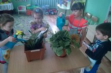 В средней группе очень много красивых растений. Но у них есть враги - это пыль и грязь, поселившиеся на цветах, и которые хотят, чтобы они засохли. Мальчишки и девчонки группы смело борются с этими злючками, надев защитные фартуки. Берут главных своих помощников в бою: лейки и тряпочки. Ребята польют наши растения, крупные листья протрут тряпочкой, с ворсистых растений смахнут пыль сухой кисточкой, а мелкие листочки будут опрыскивать.