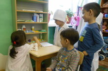 Развитие сюжета «На приёме у врача» в игре больница. Одна из самых любимых игр средней группы. Они уже знакомы с таким словами как: врач-педиатр, процедурная, медсестра и даже названия медицинских инструментов: фонендоскоп, шприц. Творчески подходят к развитию сюжета игры, а некоторые уже всерьез задумываются о будущей профессии.