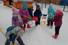 Зима - удивительное сказочное время года, раздолье для зимних игр и забав для всех детей и взрослых. Сколько веселья, радости и удовольствия доставляют детям игры в снежки, катание на санках, спуски с ледяных горок. И вот, для наших будущих построек дети вместе со взрослыми начали сгребать снег в кучи.
