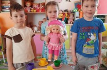 Сегодня педагог средней группы организовала с детьми сюжетно - ролевую игру "День рождения куклы Тани". Создав ситуацию приготовления к празднику, она притянула к себе внимание играющих неподалёку ребят. Малыши, заинтересовавшись игрой, втянулись в игру, в которой ребятам была предложена роль гостей куклы Тани. Ребята испекли для именниницы пирожки, используя предметы - заместители, помогли накрыть праздничный стол, рассказали кукле Тане стихи, танцевали и пели песни.
