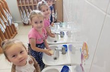В средней группе дети знают, как важно содержать руки в чистоте. Сегодня воспитатель напомнил им еще раз о привычке содержать свое тело в чистоте. В группе провели беседу о личной гигиене и значении мытья рук. Эта тема очень заинтересовала детей. Ребята очень внимательно рассматривали свои ладошки – очень хотелось увидеть микроба. Во время беседы дети вспомнили, как надо мыть руки, в умывальной комнате повесили картинки-напоминания «Как правильно мыть руки», а в группе дежурил патруль «Помощник Мойдодыра».