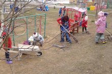 Проводили холодную зиму, встречаем зеленую весну! Много радости и хлопот приносит весна с собой для всех. Животные, растения активно пробуждаются, а у людей прибавляется работа на огородах, в садах и на улице. Главная забота – это уборка мусора, которая накопилась за зиму. Вот и мы вышли на уборку своего участка. С большим удовольствием ребята собрали прошлогоднюю листву, сгребали ее в кучи, собирали камушки, сломанные веточки, разрыхляли песок. И всю эту работу ребята выполняли с помощью инструментов и оборудования, которые сделали папы своими руками. Первая весенняя уборка прошла очень весело!