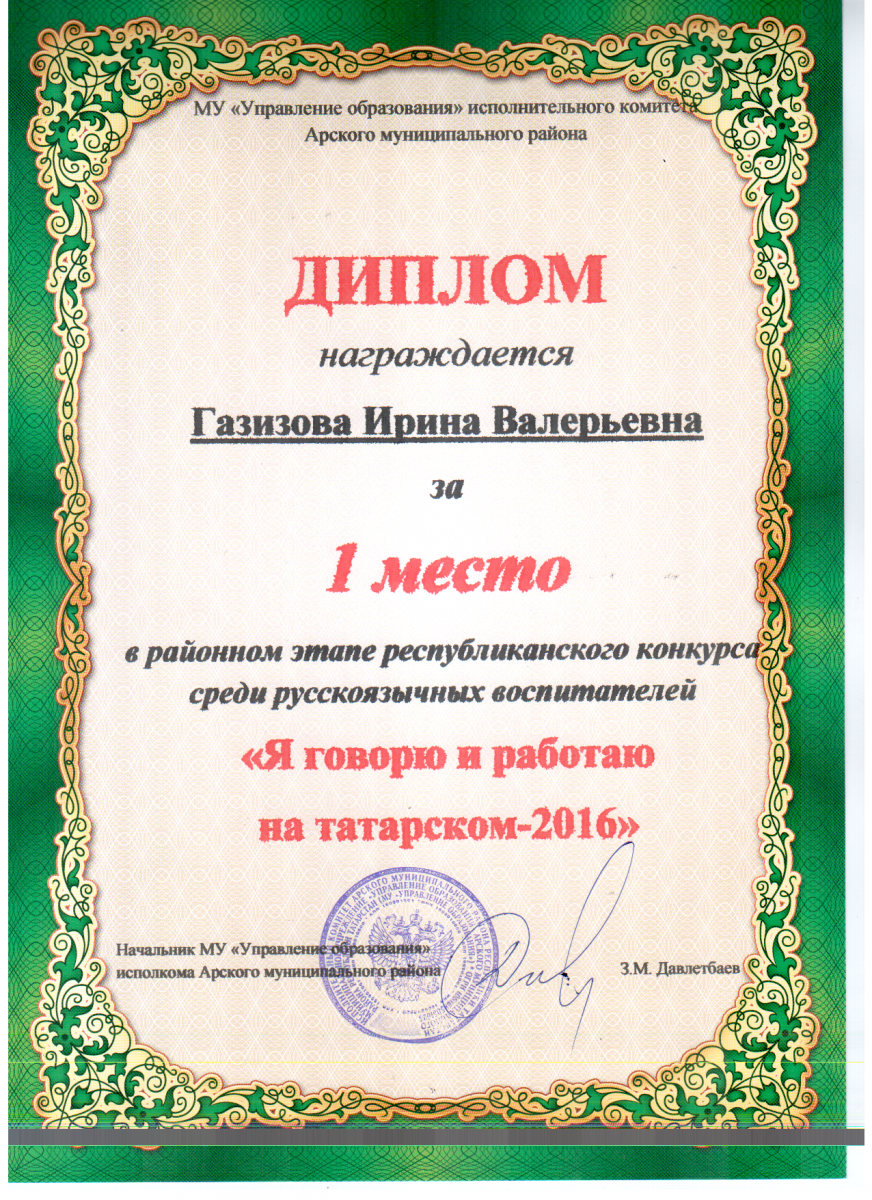 1 место на муниципальном этапе конкурса Говорю и работаю по татарски-2016.png
