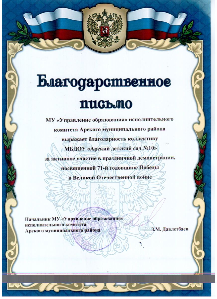 Благодарственное письмо за активное участие в праздничной демонстрации 2016.png