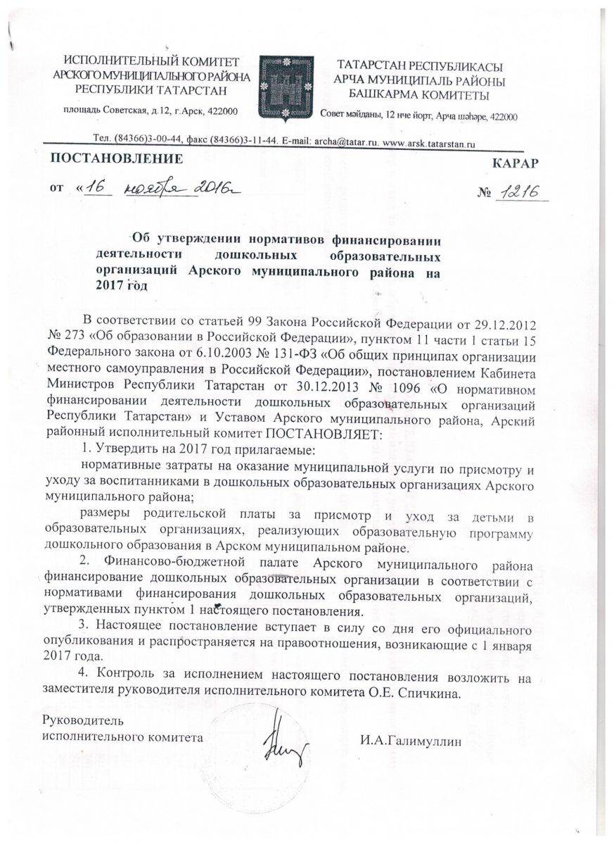 Согласно Постановлению Исполнительного комитета Арского муниципального района Республики Татарстан №1380 от 02.12.2017 г. с 01 января 2018 года повышается размер родительской платы за присмотр и уход за детьми в образовательных организациях, реализующих образовательную программу дошкольного образования Арского муниципального района