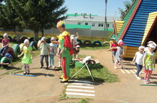 В старшей группе №2 прошло развлечение на воздухе. Дети играли, веселились, соревновались. А помогал им в этом клоун Бим. (Воспитатель Ганиева Р. З.).