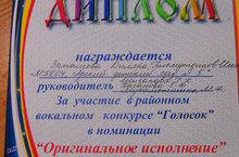 Поздравляем Замалиеву Диляру и Гильмутдинова Ильяса за участие в районном конкурсе "Голосок" в номинации "Оригинальное исполнение".