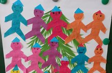 Цель:Учить создавать изображение из бумаги. Закреплять умение: вырезать на глаз детали, аккуратно наклеивать изображения на большой лист.Упражнять в вырезании симметричных частей одежды из бумаги, сложенной вдвое. Формировать навыки коллективной работы. Развивать чувство цвета, композиции.