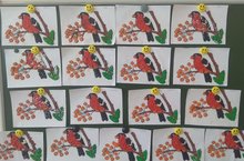Лепка "Снегири". Развивать умение лепить птиц: снегиря. Передавать их строение: туловище, голова,лапы, хвост. Формировать умения лепить картину на картоне. Лепить птиц конструктивным способом лепки. Воспитывать стремление добиваться нужного результата. продолжать воспитывать аккуратность в работе с пластилином.