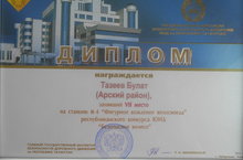 Поздравляем ученика 5А класса Тазеева Булата, занявшего 7 место на станции №4 "Фигурное вождение велосипеда" республиканского конкурса ЮИД "Безопасное колесо", состоявшегося в г. Набережные Челны. Молодец!!!