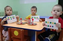 Сегодня с детьми младшей группы провели аппликацию на тему: "Разноцветные огоньки в домиках"
