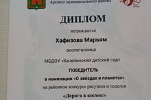Безнең тәрбияләнүчебезгә район конкурсында катнашкан өчен "Космоска юл" диплом бирелде!!!