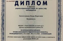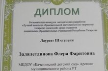 Воспитатель Залялетдинова Ф.Ф. участвовала в региональном конкурсе методических разработок "Лучший конспект образовательной деятельности по творчеству татарских писателей". И награждена дипломом лауреат III степени. Желаем дальнейших успехов в профессиональной деятельности.