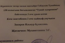Г. Тукайның 130 еллыгына багышланган "Тукай эзләреннән" бәйгесендә 2 нче сыйныф укучычсы Закиров Ильнур 3 нче урынны яулады. Аны уңышы белән котлыйбыз! Җитәкчесе - Мөхәмәтшина Э. Г.