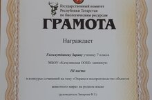 7 нче класс укучысы Гыйльметдинова Зәринә "Хайваннар дөньясы объектларын саклау һәм торгызу" темасына иншалар конкурсында катнашып 3 нче урынга лаеклы булды. Грамота һәм истәлекле бүләкләр белән бүләкләнде. Котлыйбыз.