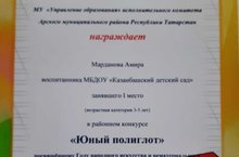 Безнең уңышлар! 25.05.2022 19 май көнне Арчаның 6 нчы балалар бакчасында район күләмендә үткәрелгән "Юный полиглот" шигырь бэйгесе узды. Безнең бакчада тәрбияләнүче Марданов Әмир бу конкурста 1 нче урынны яулады. Котлыйбыз!
