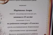 Районкүләм " Голосок" бәйгесендә Марданов Әмир икенче урын алды.Афәрин!Әмирнең әти-әнисенә,тәрбияче апаларына,бәйрәмне оештыручыларга зур рәхмәтебезне белдерәбез.