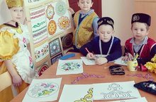 Укучылар татар халкының милли орнаментлары белән танышу максатыннан түгәрәк өстәл артына җыелдылар.Бүгенге көнгә хәтле абруен югалтмаган түбәтәй,калфаклар өчен милли бизәкләр ясадылар.