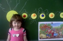 Превратим кружочки в героев сказки "Репка" и назовем всех персонажей (У репки - сверху листики; дед усатый, с бородой; бабка с платочком; внучка с бантиком; Жучка с хвостом; кошка с ушками и усиками; а у мышки - тоненький хвостик, как ниточка)