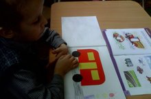 Ребенок находит недостающую часть и приклеивает на свой автобус. -