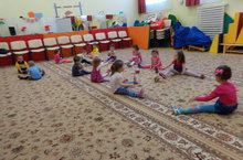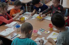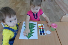 Цель: учить рисовать пальцами, используя разные цвета, закреплять знания основных цветов, развивать умение видеть образ изображаемого, воспитывать умение работать коллективно: закреплять умение выполнять простейшие танцевальные движения ("Шарики-фонарики", поворот с приседаниями) под музыку.