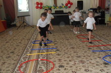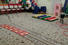 1 нче кечкенәләр төркеме белән спортзалда уйнау. Балалар төрле каршылыклар аша үтәргә өйрәнәләр. Бер-берләренең каршылыклар аша үтүен күзәтәләр. Игътибарлылык, мөстәкыйльлек сыйфатлары тәрбияләү.