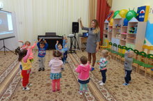 Музыка укытучысы 1 нче кечкенәләр төркеменә бию өйләтә. Максат: балаларның шалтыравыкларны дөрес кулланып, музыкага дөрес бию хәрәкәтләре ясауларына ирешү. Балаларда кече яшьтән үк бию сәнгатенә мәхәббәт тәрбияләү.