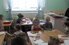 Мәктәпкә әзерлек төркеме белән рус теле шөгыленнән эш дәфтәрләрендә эшләү. Максат: балаларга биремне дөрес эшләргә өйрәтү. Аларның уйлау сәләтләрен, фикер йөртү дәрәҗәләрен тикшерү. Төсләрне ике телдә дә дөрес итеп әйтә белүләренә ирешү.