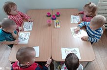 Занятие в младшей группе. Задача: Совершенствовать умение рисовать пальцем, стараясь равномерно расположить рисунок (горошинки) внутри контура.