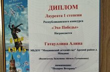 Наша воспитанница Гатауллина А.А.участвовала в республиканском конкурсе "Эхо Победы" и была награждена дипломом лауреата I степени. Поздравляем!!!