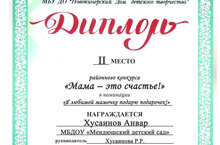 Яңа Кенәр балалар иҗаты йорты оештырган "Мама - это счастье" район конкурсында катнашып Хөсәинов А.Р. 2 нче урын яулады. Җитәкчесе Хөсәинова Р.Р.