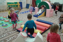 1 нче кечкенәләр төркеме белән спортзалда төрле уеннар уйныйбыз. Кайбер балалар таудан шуа, кайберләре йомшак машиналарда йөри, төрле коврикларда сикерәләр. Балаларга күмәкләшеп уйнавы бик күңелле.