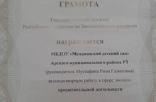 Безнең балалар бакчасы Татарстан Республикасы табигатне саклау комитеты грамотасы белән бүләкләнде.