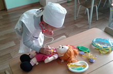Максат: Уенда табиб һөнәре турындагы белемнәрен куллана алуларына ирешү, әлеге намуслы хезмәткә кызыксыну уяту; авыру кешегә ярдәм итәргә теләк булдыру, игътибарлылык һәм сабырлык формалаштыру, кызгану хисе тәрбияләү. Табиб өчен кирәкле булган атрибутлар, әсбаплар сайлап алырга, шул кирәк-яраклардан дөрес кулланырга күнектерү. Уен җиһазларына сакчыл караш тәрбияләү.
