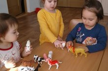 1 нче кечкенәләр төркеме. Максат: 1) балаларның йорт хайваннары турындагы белемнәрен киңәйтү; бозау, бәрән, колын, кәҗә бәтие сүзләре хисабына сүзлекне баету һәм активлаштыру; тәрбияче күрсәтмәләрен үтәү осталыгы формалаштыру; 2) игътибарны, хәтерне үстерү; 3) башкаларга ярдәм итү теләге, тыңлаучанлык, хайваннарга карата кайгыртучанлык тәрбияләү.