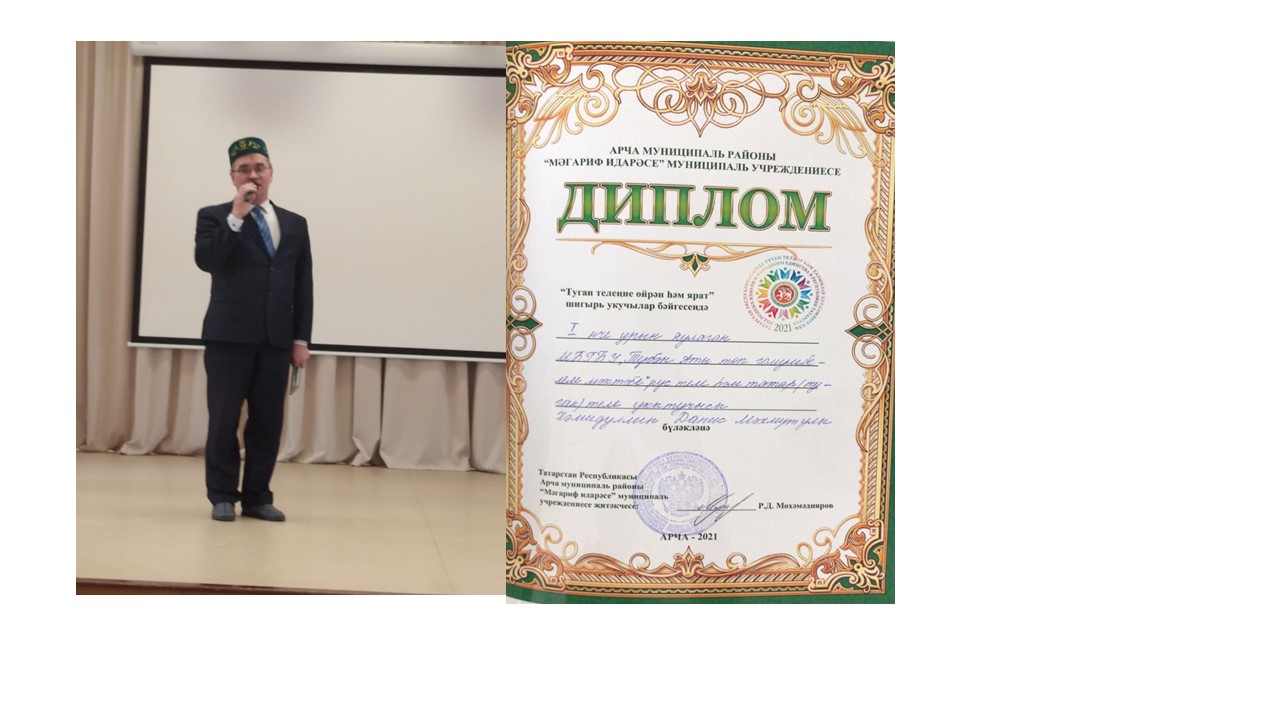 19 нчы февральдә Арча муниципаль районы муниципаль бюджет гомуми белем учреждениесе Арча 6 нчы урта гомуми белем мәктәбе» базасында “Туган телеңне өйрән һәм ярат” шигырь укучылар бәйгесе уздырылды. Мәктәбебезнең рус теле һәм туган тел укытучысы Хәмидуллин Д.М. матур гына чыгыш ясап, I урын диплом белән бүләкләнде. Данис абыйга сәламәтлек, эшендә зур уңышлар телибез.19 февраля на базе МБОУ «Арская СОШ № 6» Арского муниципального района был проведен конкурс чтецов «люби и изучай родной язык». На этом конкурсе успешно выступил учитель русского и родного языка нашей школы Хамидуллин Д. М. Он награжден Дипломом . Желаем Данису Махмутовичу здоровья, больших успехов в работе.