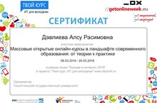 Команда учителей МБОУ «Нижнеатынская ООШ» в составе Хасанова Э.И., руководитель команды, Давлиева А.Р., учитель начальных классов, Даутова Р.Г., учитель начальных классов, Кадырова Л.Ф., учитель английского языка, Шамсетдинова Ф.Ф., учитель информатики и физики участвовали в мероприятиии «Массовые открытые онлайн-курсы в ландшафте современного образования: от теории к практике» в рамках акции «Выходи в Интернет 2016» и проекта «Твой курс: ИТ для молодежи»