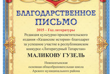 В ноябре 2015 года прошел Конкурс «Литературный Татарстан» в рамках Года литературы. , организованный по инициативе сетевой газеты «Казанские истории» Он был призван стимулировать интерес школьников к литературному краеведению, к истории Казани и Республики Татарстан в целом. Его организаторами также выступили Министерство образования и науки Республики Татарстан; Казанский национальный исследовательский технический университет имени А.Н.Туполева, конкретно – кафедра истории и связей с общественностью; Централизованная библиотечная система г. Казани, конкретно – библиотека-филиал №20, Городской дворец детского творчества имени А.Алиша. Участникам конкурса предлагалось ответить на 75 вопросов. На конкурсе пришли 264 работы: 23 – от учителей и библиотекарей, 241 – от учащихся. Среди участников есть и наша ученица 8 класса Маликова Гузель. Она набрала 101 балл и награждена Благодарственным письмом. Поздравляю!