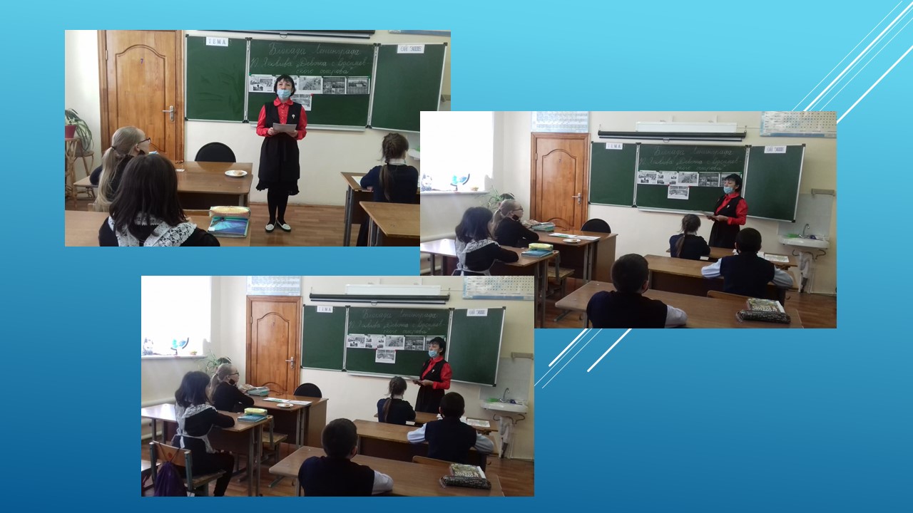 «Блокада икмәге» акциясе кысаларында алтынчы сыйныф укучылары белән тәрбия сәгате үткәрелде. Блокаданы үзе кичергән Таня Савичева турында балалар аеруча тетрәнеп тыңладылар. Балаларга Ю.Яковлеваның «Васильев утравындагы кыз» китабын укырга тәкъдим ителде.